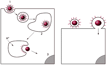 Справа — слияние с плазматической мембраной.Другие вирусы, например вирус иммунодефицита человека (HIV), не нуждаются для активации в низких рН и проникают в клетку более простым путем, в ходе которого их оболочки сразу сливаются с плазматической мембраной, и наследственный материал оказывается к клетке. Теперь ему остается только добраться до ядра.