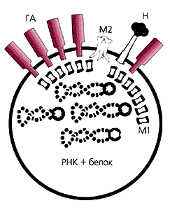 ГА — гемагглютинин, М2 — ионный канал, Н — нейраминидаза, М1 — белковая оболочка.Структура гемагглютинина