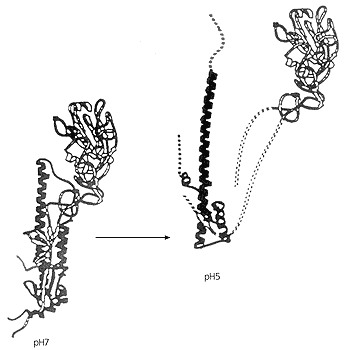 На поверхности вирусной оболочки гемагглютинин присутствует в виде тримеров. Каждая его молекула состоит из двух субъединиц: ГА1, обеспечивающей первичный контакт с клеткой-мишенью, и ГА2, отвечающей за слияние. В исходном, нейтральном, состоянии (при рН7) все тримеры ориентированы примерно перпендикулярно к поверхности мембраны, их протяженность ~13 нм. Каждая молекула гемагглютинина прочно заякорена в своей мембране и, что очень важно, имеет в своем составе короткий (25 аминокислот) пептид, который при рН7 спрятан внутри тримера и локализован недалеко от основания белка. После уменьшения pH с 7 до 5 молекулы гемагглютинина глобально перестраиваются, и пептид слияния не просто выходит на свободу, а перемещается в самый верхний конец молекулы и проникает в мембрану жертвы.