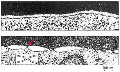 внизу — то же, но рН 4.9 — видно большое количество контактных областей (цветная стрелка).