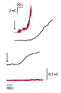 По оси ординат — проводимость, по оси абсцисс — время.