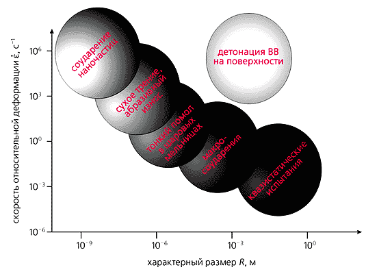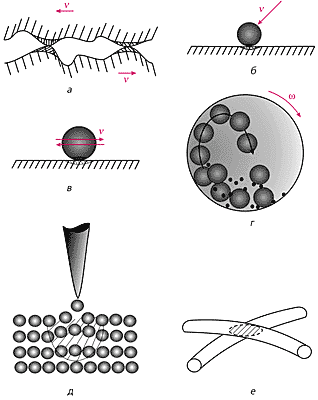 По мере удаления от точки контакта напряжения и деформации быстро падают и не представляют уже никакой опасности для материала. Благодаря крайней малости локально деформированной области (R<1 мкм) скорость относительной деформации, определяющая атомные механизмы пластического течения, e· = de/dt = = dR/R·dt = v/R (даже при невысоких скоростях абсолютного перемещения v<1 м/с) достигает значений 106 с–1, характерных для деформации детонирующим взрывчатым веществом (рис.2). Таковы условия при сухом трении одного тела по поверхности другого, механическом шлифовании, абразивном износе (например, при движении ленты вдоль магнитных головок в магнитофоне), при накоплении повреждений в результате соударения пылинок с поверхностью движущихся транспортных средств (в том числе и космических), при тонком помоле в различных мельницах и в активаторах механохимических реакций, в контактных модах зондовой атомно-силовой микроскопии и при модификации поверхности, в вершине быстро растущей квазихрупкой трещины и во многих иных ситуациях (рис.1). Атомарные процессы, которые происходят при этом в тонких приповерхностных слоях, определяют служебные свойства изделия, его долговечность, износостойкость, коэффициент трения, химическую и каталитическую активность поверхности, ее способность эмитировать электроны и другие частицы, а также многое другое. До последнего времени эти процессы изучались главным образом феноменологически на макроуровне путем усреднения характеристик по всей кажущейся поверхности контакта. Поэтому большинство подобных проблем находилось в ведении инженеров-механиков, технологов, электриков.Рис.1. Примеры ситуаций, в которых реализуется наноконтактное взаимодействие (v - линейная скорость, w - угловая скорость; тонкая штриховка обозначает области высокой локальной деформации): а - сухое трение, абразивный износ при латеральном перемещении одной микрошероховатой поверхности по другой;