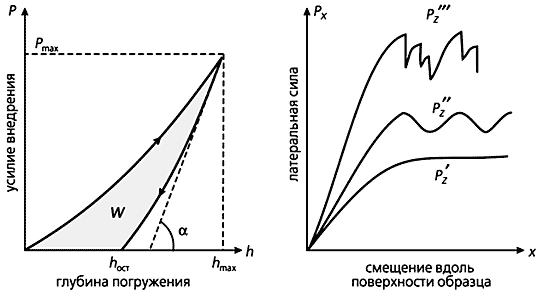В соответствии с направлением движения зондирующего поверхность инструмента (чаще всего это хорошо аттестованная трехгранная алмазная пирамидка Берковича) по отношению к плоскости образца их подразделяют на наноиндентирование (индентор движется по нормали к поверхности) и наносклерометрию (индентор движется по касательной к поверхности). Сущность этих методов состоит в программируемом приложении малых или ультрамалых усилий к индентору и непрерывной регистрации зависимости силы сопротивления Р от смещения (глубины погружения h или тангенциального перемещения x). Типичные записи диаграмм для обоих случаев показаны на рис.4.