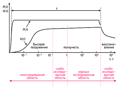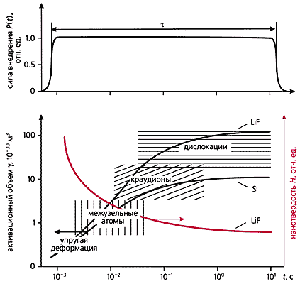 Упоминавшаяся выше неправомерность рассмотрения a priori процесса индентирования как автомодельного диктует необходимость специального изучения начальных стадий погружения с адекватным пространственно-временны?м разрешением. Как известно, наиболее полно и просто динамические свойства системы могут быть исследованы путем анализа ее отклика на скачкообразное возмущение. В одном из разработанных методов реализован этот подход: постоянная испытательная нагрузка прикладывается к индентору скачкообразно, и кинетика его погружения в материал регистрируется непрерывно (рис.5).