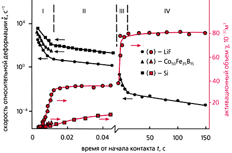 Рис.6. Зависимости скорости относительной деформации e и активационного объема g от продолжительности контакта для некоторых материалов. Римскими цифрами обозначены различные стадии в процессе формирования отпечатка.Силовая зависимость скорости погружения в координатах lg e· = f(s) имеет участки, близкие к линейным, что позволяет путем экстраполяции в точку s0 = 0 определить эффективные значения начальной скорости деформации e0 на каждой стадии при различных температурах Т. Зависимость lg e0 = f(1/T) в некотором диапазоне температур (различном для разных материалов) также оказывается линейной. Все это дает право говорить о термоактивированном режиме деформации, протекающей в соответствии с аррениусовским уравнением e· = e0 (exp(U – gs)/kТ) (здесь U - энтальпия активации, s - среднее действующее напряжение в контакте, g - активационный объем, т.е. объем материала, в котором происходит деформация в результате одной термической активации). Активационные объемы, полученные из наклонов зависимостей lg e· = f(s), имеют на начальных стадиях погружения очень низкие значения ~ 10–3 нм3 (порядка одного атомного) для всех исследованных материалов (рис.6), что прямо свидетельствует о деформации за счет движения отдельных атомов. Опыты по влиянию всестороннего внешнего давления на скорость диффузии дают также значения g около 0.6ё0.7 от величины атомного объема. Разумеется, существуют и дислокационные механизмы пластичности, характеризующиеся малыми значениями g (например, переползание), однако они слишком “медленные” для того, чтобы обеспечить скорость относительной деформации e > 103 с–1, реализующуюся на начальных стадиях внедрения.По мере углубления индентора и перехода ко второй и последующим стадиям, когда динамическое значение Н начинает приближаться к статическому (t > 10-12 мс), g в ионных кристаллах увеличивается до значений 0.1 нм3 (рис.6). Это свидетельствует о преимущественно дислокационном механизме течения материала под индентором на поздних стадиях внедрения. Из результатов независимых экспериментов хорошо известно, что для дислокационной пластичности в ионных кристаллах характерны величины g в несколько сотен атомных объемов, что и наблюдается на заключительных стадиях внедрения индентора. Но в кристаллах Ge, Si и аморфных сплавах Co50Fe35B15 величина g и на заключительной стадии составляет менее 10 атомных объемов. Существует также много других свидетельств значительной роли точечных дефектов при локальном деформировании, полученных независимыми (правда, чисто качественными) методами [15, 16]. В ионных кристаллах переход от первой стадии погружения индентора ко второй наряду с быстрым увеличением g сопровождается сильным ростом U и плотности поглощаемой энергии. Схематическое изображение смены доминирующих механизмов деформации при формировании отпечатка представлено на рис.7. Здесь отдельная зона отведена точечным дефектам особой конфигурации - краудионам (одномерным сгущениям в расположении атомов, когда лишний атом внедряется вдоль определенного кристаллографического направления).