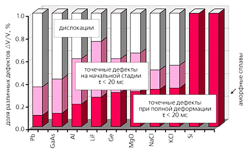 при наноиндентировании для различных материалов.Из приведенных данных вытекает, что с уменьшением продолжительности контактного взаимодействия и размеров отпечатка роль и вклад точечных дефектов возрастает, а дислокаций - падает. Поэтому анализ микроконтактной пластичности, возникающей во многих практически важных ситуациях, должен в большей степени опираться на представления о модах пластичности с участием точечных дефектов, нежели дислокаций. Завершая обсуждение динамики наноконтактов, укажем на неожиданную аналогию: поднятые проблемы до некоторой степени схожи с теми, которые возникли в космологии при анализе динамики расширяющейся Вселенной (та же сингулярность в “нуле” времени, те же изменения всех существенных параметров на много порядков величин, та же смена “эпох” по мере течения времени и роста характерных размеров задачи).