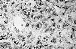 Увел. 320.Наиболее часто цитомегалы встречаются в слюнных железах, почках, печени, поджелудочной железе, кишечнике, надпочечниках, щитовидной железе, мозге и легких. Поскольку вирус выделяется с мочой, носоглоточным секретом, слюной, спермой, молоком, кровью, заражение соответственно может быть перинатальным, трансплацентарным, через грудное молоко, трансфузию крови и ее препаратов, половым и контактно-бытовым. Когда-то из-за частого обнаружения в слюне пациентов цитомегаловирусных включений даже существовал термин “болезнь поцелуев”. Распространенность этой инфекции зависит от социально-экономических и гигиенических условий жизни. У лиц, имеющих более низкий уровень жизни и проживающих в условиях скученности, антитела к цитомегаловирусу определяются чаще.
