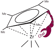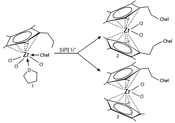 Цирконий сразу обнаружил особенности своего характера. Во всех полусандвичах он отчетливо демонстрировал координационную ненасыщенность, привлекая для заполнения координационной сферы не только хелатную группу, но и растворитель, например тетрагидрофуран. Молекулу растворителя цирконий охотно обменивал на ЦП-лиганд с хелатирующей веткой или без нее, отчетливо показывая, что с ЦП-лигандом возникают энергетически более выгодные структуры.
