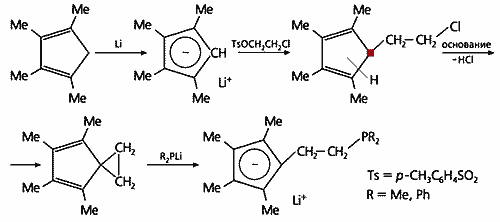 Вначале рассмотрим получение лигандов с хелатирующей группой PR2 (рис.2). На первой стадии метилированный циклопентадиен образует с литием ионное соединение, которое далее при взаимодействии с эфиром толуолсульфокислоты (тозилатом, Ts) переходит в соединение, содержащее ветку –CH2–CH2–Cl, и представляет собой смесь изомеров. Об этом можно судить по тому, что у одного атома водорода связь направлена не к конкретному углероду, а в середину цикла. Так что изомеры отличаются положением атома водорода — он может занимать место у любого углеродного атома в цикле. Все изомеры находятся в равновесии, но если один из них начнет участвовать в какой-либо реакции, его концентрация понизится и оставшиеся изомеры станут перестраиваться, чтобы повысить до равновесного уровня количество исчезающего изомера. Тот изомер, у которого блуждающий атом водорода находится в точке присоединения ветви –CH2–CH2–Cl, отщепит HCl, и в результате возникнет спироцикл (два цикла, соединенные одним общим атомом). На последней стадии трехчленный цикл размыкается под действием диметилфосфида (или дифенилфосфида) лития R2PLi. В итоге образуется запланированный лиганд: метилированный циклопентадиенильный анион с хелатным хвостом –CH2–CH2–PR2. И кроме того — катион лития, который позволит в дальнейшем присоединить к лиганду цирконий.