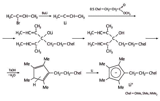 Для получения лигандов, содержащих хелатирующие атомы азота, кислорода или серы, рассмотренный способ не применим, поскольку никакие реагенты с этими атомами не способны раскрывать спироцикл. Поэтому мы решили собирать пентадиенильные циклы из фрагментов, поместив хелатирующие ветви в исходные заготовки (рис.3). От бромированного бутена переходим к его литийпроизводному. Две такие молекулы объединяем в одну с помощью связывающего центра, который уже содержит ветку с хелатирующей группой (это было предусмотрено заранее). Разветвленную молекулу замыкаем в цикл и далее переводим его в литийпроизводное. В результате получаем такие же лиганды, как тот, что показан на рис.2, но с иными хелатирующими атомами.