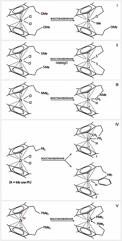 Наиболее интересные превращения мы наблюдали, когда стали восстанавливать комплексы, в которых хелатирующими группами были РR2 (R — Me или Ph). Цирконий не привлекал для своего окисления метильные остатки, связанные с фосфором, а использовал находящуюся рядом Ме-группу из циклопентадиенильного лиганда, разорвав в ней связь С–Н, в результате чего неожиданно возникла связь С–Zr (схема IV, соединение 1). Это уже разрыв связи в “настоящей” метильной группе, такая входит в состав углеводорода. Здесь хелатная группа работает по прямому назначению — заполняет координационную сферу металла.