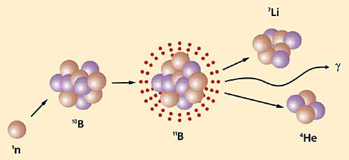 Научный подход к применению радиоактивного излучения в терапии рака оказался возможным благодаря стремительному развитию ядерной физики в 30-х годах XX в. В 1932 г. Дж.Чедвик открыл нейтрон (за что получил Нобелевскую премию), а в 1934 г. Д.Ли обнаружил, что захват нейтрона ядром сопровождается испусканием g-кванта. Эти открытия стали основой ядерной медицины - научного направления на стыке физики, химии и медицины. В дальнейшем было изучено взаимодействие нейтронов с ядрами различных элементов. Результаты привели в 1936 г. Г.Лочера к оригинальной идее лечения онкологических заболеваний [1]: вначале следует ввести в раковые клетки препарат, содержащий стабильный изотоп бора 10В, а затем обработать его потоком тепловых нейтронов невысокой энергии. В итоге атом бора, захватив нейтрон, превращается в радиоактивный изотоп, который распадается с образованием лития, a-частицы (ядра гелия) и g-кванта (рис.1).