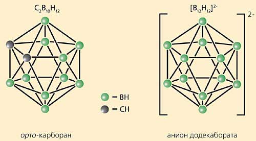 Поиск таких соединений неизбежно приводит к полиэдрическим гидридам бора, среди которых наиболее известен орто-карборан (рис.2), ставший эмблемой химии бора в конце 20-го столетия. Появление орто-карборана буквально открыло в химической науке новую главу, посвященную соединениям, которые построены с помощью нетрадиционных трехцентровых связей и обладают объемной ароматичностью. Превращения карборана изучены весьма детально, и потому пути его направленной химической модификации во многом определены. Это, естественно, привлекает химиков-синтетиков, вовлеченных в нейтронозахватную гонку [4, 5].