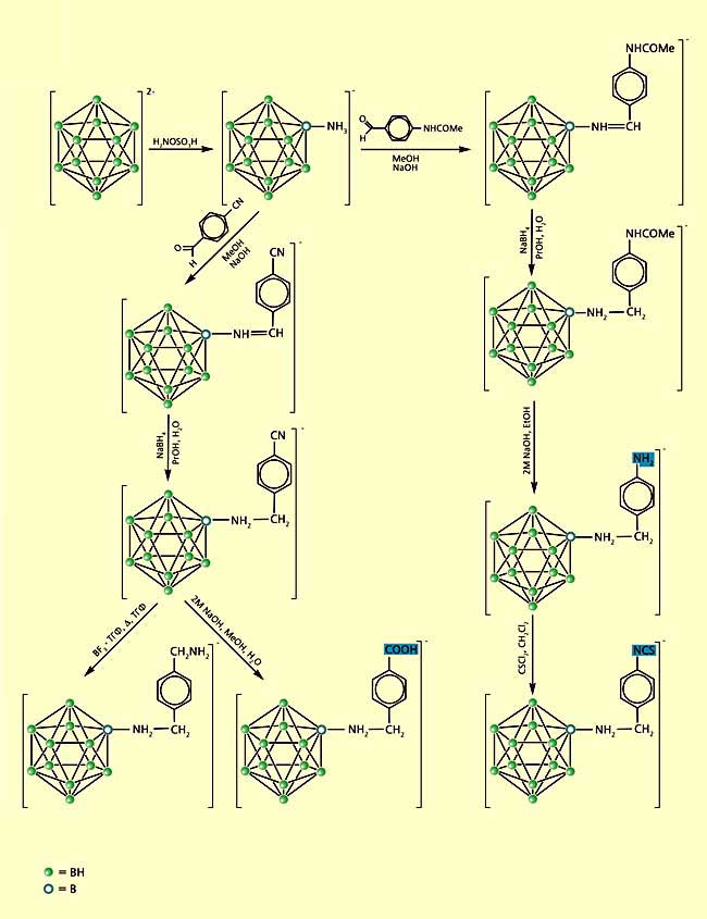 Природу вводимых функциональных групп, которые должны обеспечить накопление препарата в опухолевых клетках, мы определяли, согласуясь с опытом биохимиков. Наиболее предпочтительными оказывались амино- (–NH2), изоцианатные (–NCO), карбоксильные (–СООН) и изотиоцианатные (–NCS) группы. Помимо того, предстояло решить, как именно должны располагаться вводимые функциональные группы относительно боранового ядра. К началу нашей работы уже имелся клинический опыт использования в бор-нейтронозахватной терапии додекабората с тиольной группой - Na2[B12H11SH], относящегося ко второму поколению препаратов. К сожалению, он обладает низкой избирательностью накопления в опухолевых клетках. Чтобы устранить электронное и стерическое влияние додекаборатного фрагмента на активную группу, обеспечивающую связь с биомолекулами, мы наметили располагать ее на некотором удалении от боранового ядра, отодвинув с помощью цепочки из трех-пяти атомов.
