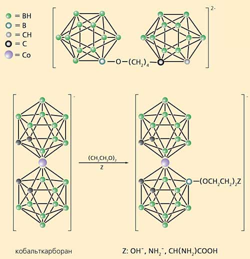 Тем не менее карборан был не лучшим кандидатом на роль “захватчика” нейтронов, поскольку имел некоторые недостатки. Прежде всего, это соединение гидрофобно, что делает необходимым дополнительное введение различных гидрофильных групп, которые позволят в конечном итоге получить водорастворимый препарат. Подобная химическая модификация карборана существенно усложняет и удорожает синтез целевых соединений, а в ряде случаев приводит к появлению нежелательной побочной биологической активности.