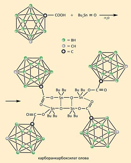 Оказалось, что бороводородные многогранники обладают еще одним замечательным свойством - они резко снижают токсичность соединений олова, сохраняя их противораковую активность. Самым результативным оказалось производное мета-карборана, в котором атомы углерода не соседствуют, а разделены атомами бора. Мета-карборанкарбоновая кислота взаимодействует с оксидом дибутилолова, образуя соответствующий карборанкарбоксилат олова (рис.7). Это соединение в 30-40 раз (в зависимости от типа опухолевых клеток) эффективнее цисплатина или фторурацила, используемых в настоящее время для лечения меланомы, а также опухолей молочной железы или кишечника [13].