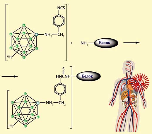 Бороводородные каркасы помогают решить и диагностическую проблему (рис.8). Связь В–I заметно стабильнее в сравнении с C–I, благодаря чему получаются соединения с устойчивой меткой [14]. Радиоизотоп 125I был выбран потому, что по химическим свойствам он идентичен другим изотопам иода, но имеет достаточно удобный для экспериментальных исследований период полураспада - 60 дней. Чтобы обеспечить предпочтительное связывание с белковыми молекулами опухолевых клеток, мы использовали уже полученное нами аминопроизводное додекабората с изотиоцианатной группой NCS (см. рис.4). Она связывается с аминогруппами белков и обеспечивает таким образом избирательную доставку радиоактивной метки в клетки опухоли [15].
