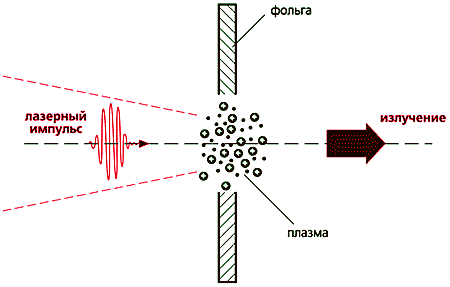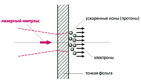 В 2000 г. при облучении тонких фольг высокоинтенсивными (более 1018 Вт/см2) лазерными импульсами были обнаружены протоны с энергией до 10 МэВ, вылетающие в основном из задней стенки фольги в направлении распространения импульса [10]. Этот результат вызвал большой интерес. Опыты были повторены во многих лабораториях. Максимальная измеренная энергия протонов в некоторых из них достигала 60 МэВ, а их число доходило до 1012 на один лазерный импульс.
