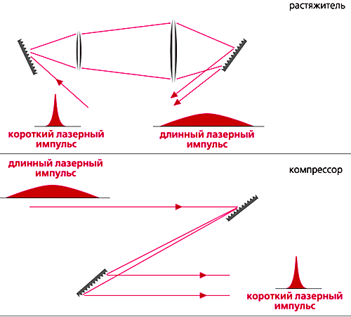 После этого длинный, чирпированный импульс, обладающий большой энергией, поступает в устройство, которое называется компрессор. Задача последнего состоит в том, чтобы снова сжать импульс до его первоначальной длины. Достигается это за счет эффекта, обратного тому, благодаря которому импульс был растянут.