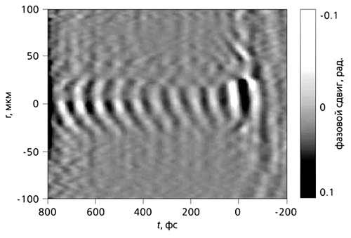 Рис.4. Возмущение плотности электронов в кильватерной волне, возбуждаемой лазерным импульсом с длительностью 30 фс и мощностью ~30 ТВт в плазме с плотностью 2.2·1018 см-3. По вертикальной оси - радиальная координата, отсчитываемая от оси импульса. По горизонтальной оси - время после прохождения лазерного импульса через данную точку. (По: Matlis N.H., Reed S., Bulanov S.S. et.al. // Nature Physics. 2006. V.2. P.749-753.)Проведенные во Франции эксперименты показали, что описанный выше механизм ускорения электронов действительно реализуется. Но полученное увеличение энергии электронов оказалось незначительным из-за очень малой длины, на которой это ускорение возникало.Сначала считалось, что для возбуждения кильватерных волн лучше всего подходят лазерные импульсы с длительностью, близкой к периоду плазменных колебаний, в то время как более длинные импульсы для этой цели не годятся. Но численные расчеты [7-9] и последующие эксперименты показали, что это не так. Лазерный импульс, длина которого значительно превосходит длину плазменной волны, а мощность превышает определенную величину, в процессе распространения в плазме изменяет свою форму (рис.5). Сначала возникает модуляция его амплитуды, а затем он разбивается на последовательность более коротких импульсов с периодом следования, равным плазменному периоду. Этот эффект получил название самомодуляции импульса. Между последовательностью коротких импульсов и плазменными колебаниями возникает резонанс. Каждый последующий короткий импульс увеличивает амплитуду той кильватерной волны, которую возбудил первый короткий импульс. В результате уже внутри лазерного импульса поле плазменной волны становится весьма большим и достигает 109 В/см. Часть электронов плазмы при этом захватывается в плазменную волну. Они начинают двигаться вместе с волной и ускоряются до энергии порядка 100 МэВ на длине в несколько миллиметров.