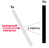 Выше уже упоминалось, что при интенсивности лазерного излучения, превышающей 1018 Вт/см2, скорость движущегося в лазерном поле электрона становится сравнимой со скоростью света. Если интенсивность составляет 3Ч1020 Вт/см2, то энергия электрона приблизительно равна 5 МэВ. Непосредственно сам электрон с такой энергией не вызывает ядерных реакций, но, пролетая в окрестности ядра, электрон излучает g-кванты с энергией в несколько МэВ. Именно эти g-кванты и взаимодействуют с ядром, вызывая так называемые фотоядерные реакции. Обычно в результате такого взаимодействия g-квант выбивает из ядра нейтрон. Образовавшееся ядро соответствует изотопу исходного элемента и, как правило, через какое-то время распадается. Измеряя характеристики продуктов распада, можно удостовериться в том, что произошла фотоядерная реакция. На рис.9 показана схема эксперимента [12], результаты которого были опубликованы в 2000 г. К настоящему времени такие фотоядерные реакции, стимулированные мощными лазерными импульсами, наблюдались для многих элементов.