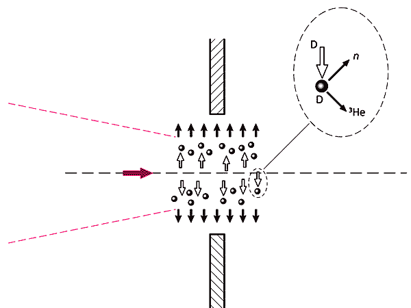 Рис.9. Схема эксперимента по фотоядерным реакциям. Левая фольга из тантала служит для генерации g-квантов. В правой фольге из меди происходит фотоядерная реакция 63Cu + g ® n + 62Cu. Изотопы 62Cu распадаются с выделением позитронов, которые регистрируются.Другой тип ядерной реакции был реализован в 1998 г. [13]. Лазерный импульс направлялся на специально приготовленную плоскую фольгу толщиной 200 мкм, содержащую атомы дейтерия - изотопа водорода, ядро которого состоит из одного протона и одного нейтрона. Первый достаточно длинный (3Ч10-10 с) лазерный импульс ионизовал вещество мишени и образовывал плазму. Второй, более короткий (6Ч10-14 с), интенсивный (1018 Вт/см2) и узкий (диаметр 4.5 мкм) лазерный импульс направлялся на эту плазму, выталкивал в радиальном направлении электроны, образуя оголенные ионы. Оставшись без электронов, одноименно заряженные ионы расталкивались и разлетались (так называемый кулоновский взрыв) (рис.10). При этом они приобретали большую скорость, сталкивались с находящимися вне лазерного фокуса медленными ионами и вызывали реакцию слияния двух ядер дейтерия. В результате последней реакции образовывались нейтроны с энергией 2.45 МэВ, которые регистрировались. Рис.10. Схема эксперимента по D-D реакции. На мишень из [C2D4] падает сначала лазерный импульс, создающий плазму. Затем падает второй ультракороткий импульс, образующий плазменный канал. Выброшенные в радиальном направлении ионы дейтерия сталкиваются с медленными ионами дейтерия. В результате реакции D + D ® 3He(0.82 МэВ) + n(2.45 МэВ) возникают нейтроны, которые регистрируются.Возможность инициирования ядерных реакций с помощью лазеров привлекательна с экологической точки зрения. С помощью фотоядерных реакций долгоживущие радиоактивные элементы могут быть преобразованы в их короткоживущие изотопы.Синхротронное и субмиллиметровое излучение