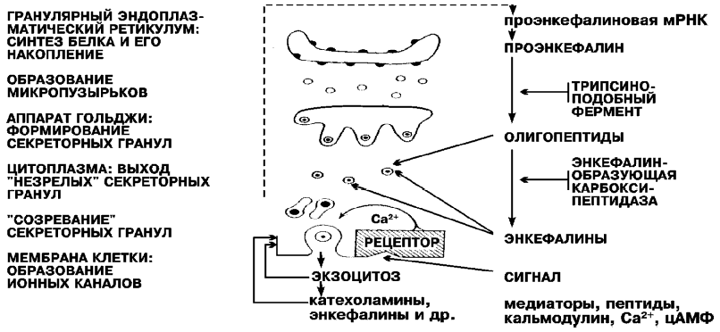 Существует сложный биохимический процесс биосинтеза пептидов в клетке: экспрессия (“возбуждение”) соответствующих генов, образование особой рибонуклеиновой кислоты, считывание, как с конвейера, ленты аминокислотных “кирпичиков”, образующих белковую молекулу, далее разрезание этих белков на блоки определенной структуры. Все это — точно прослеженные биохимические процессы, изученные для большинства физиологически значимых пептидов. Более того, тонкая генно-биохимическая “кухня” работает в строгой ПРИУРОЧЕННОСТИ к функции органа и к определенному ритму его деятельности. Вот здесь — в “привязке” к работе органа, в соответствии его функциональной “ритмике” — главное содержание регуляторной роли нейропептидов. Понятие “нейропептиды” появилось 30 лет назад, когда в мозге открыли вещества, влияющие на центральные функции высших организмов. Они были названы эндорфинами и энкефалинами и дали начало изучению большой и значимой группы опиоидов, список которых пополняется и поныне. Нейропептиды оказались как бы НАД группами других, “периферических”, пептидов, регулирующих работу сердца, почек, кишечника. Выяснилась также причастность к работе мозга ранее известных пептидных гормонов и их фрагментов — АКТГ, соматостатина, окситоцина. Со временем в мозге открывались новые и новые нейропептиды, влияющие на все многообразие его функций. ...Стало давним штампом сравнение мозга с компьютером. Оно базируется на внешней оценке работы нервной клетки — приеме, переработке и передаче информации, а также на анатомическом подобии гигантской нейронной сети мозга, которую напоминали первые компьютерные агрегаты. Считается, что 1.5 кг мозга человека содержат около 100 млрд нервных клеток, а в 1 мм3 нервной ткани вмещается более 40 тыс. нейронов! Однако вся эта “коммуникационная анатомия” тысячекратно усиливается, если принять во внимание, что каждый нейрон имеет не менее 100—1000 синапсов (единиц соприкосновения с другими клетками). Поэтому вероятный запас коммуникационных возможностей мозга на два-три порядка больше. Значит, современный человек может оценивать собственный мозг как гигантский компьютерный зал, целое “государство” компьютеров высокой надежности, разнообразного класса и назначения. Но жизнь этого “государства” и работа его подразделений (зон, ядер мозга), даже отдельных нервных клеток нуждается в постоянном управлении — поддержании рабочего тонуса и его изменении в зависимости от меняющихся потребностей организма. Исключительная насыщенность нервной ткани дает повод пойти по ложному следу. Срабатывает стереотип: это “много” связать с разнообразной работой мозга; перенести КОЛИЧЕСТВЕННУЮ сложность анатомической структуры на объяснение полифонии выполняемых функций. Стереотип связывался с возможностью синтеза специфических пептидов, ответственных за память, сон, страх, агрессивность и т.п. Впервые это случилось в 60-х годах, в пору интенсивного развития нейрокибернетики, когда была популярна идея, что специфичность получаемой мозгом информации определяется синтезом определенных химических молекул. Множественность функций, присущих мозгу, пытались ассоциировать с его возможностью синтезировать великое и разнообразное множество пептидов. Эта посылка получила развитие в теории Г.Унгара, сформулиро
