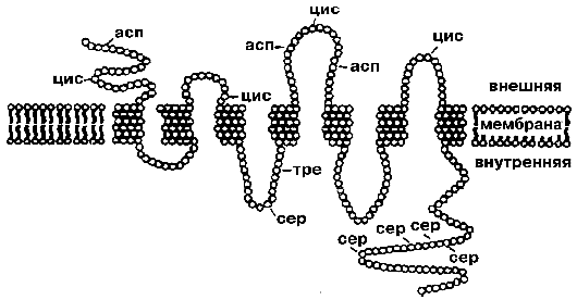 Одно из важнейших условий реализации правила “ГДЕ?” — рецептор. Эта маленькая белковая единица, вмонтированная в мембрану клетки, — входные ворота, через которые информационный сигнал превращается в физиологический акт. Структуру рецептора — состав, последовательность и пространственное расположение аминокислот — можно достаточно точно определить с помощью современной генной технологии, так называемой гибридизационной нейрохимии. Биохимическая цепочка биогенеза нейропептида завершается его взаимодействием со “своим” рецептором на основе химического закона “узнавания”. С этого момента процесс обретает новое качество — он превращается в результат. Обнаружение специфических для определенного нейропептида рецепторов в какой-либо клетке, ткани, органе означает его причастность к регуляции исследуемого процесса. Рецепторы обнаружены почти для всех физиологически значимых пептидов. Более того, для многих из них установлены подтипы рецепторов, специфичных для различных клеток и для определенных химических вариаций пептида. Типична, например, ситуация, когда фрагмент большой молекулы пептида, образовавшегося в результате ее ферментативного расщепления, становится антагонистом “своего же” рецептора. Знаменательна история открытия опиоидных (морфиноподобных) нейропептидов. В 1972 г. шотландские фармакологи Г.Костерлиц и Дж.Хьюз обнаружили в нервной ткани рецепторы, лигандные (т.е. предпочтительно связывающиеся) для морфина — вещества, которое не синтезируется в клетках животных. Но это открытие означало: если есть воспринимающая субстанция — рецептор, в организме должен быть и его “контрагент” — вещество, специфически связывающееся с этим рецептором. Так были открыты энкефалины и эндорфины — первые эндогенные опиоидоподобные нейропептиды. Обнаружение специфичных рецепторов означает возможность фармакологического воздействия на физиологическую функцию с помощью веществ, имитирующих структуру пептида, которые будут действовать как антагонисты рецепторов или агонисты-усилители физиологического эффекта. Способ управления физиологической функцией, а значит возможность воздействия на патологические процессы с помощью таких препаратов представляет огромный интерес для современной фарминдустрии, где исследовательские, медицинские и финансовые интересы связаны короткой “упряжкой”. Структура AT(1)-ангиотензинового рецептора. Показана локализация полипептидной цепочки рецептора в мембране клетки с обозначением ключевых аминокислот в его структуре. |