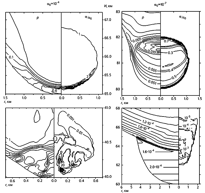 Пространственная эволюция течения по мере опускания сферического облака в атмосфере. Изолинии давления воздуха p (атм, левые части рисунков) и объемной доли частиц a/a0 (правые части рисунков) показаны в полуплоскости высота—радиальная координата ввиду предполагаемой осевой симметрии течения. Даны картины динамики для плотного (с начальной концентрацией частиц a0=10–4) и разреженного (a0=10–7) облаков.Для малой концентрации частиц (например, при a0=10-7) процесс взаимодействия сразу охватывает весь объем влетающего облака. Головная ударная волна вначале не образуется. В пределах облака, а затем и с некоторым отставанием от него, образуется волна сжатия, которая постепенно усиливается, превращается в ударную волну (гораздо более слабую, чем в первом случае), проходит через почти полностью испарившееся и затормозившееся облако частиц и вырывается вперед.