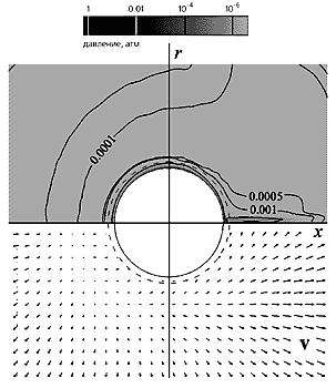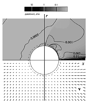 На двух рисунках представлены распределение давления (тоновая шкала), плотности газа (изолинии с отмеченными значениями — в единицах невозмущенной плотности атмосферы у поверхности планеты) и поле скоростей газов (стрелки). Левый рисунок дает картину в момент времени t = 600 с после начала вторжения для первого случая. Максимальная скорость в показанной области достигает почти 30 км/c, что в шесть раз больше второй космической. Поэтому разлетающийся газ уже не сможет вернуться к планете и покинет ее навсегда. Распределение плотности показывает, что унос массы атмосферы в основном происходит в направлении движения пылевого облака, т.е. облако как бы срывает атмосферу с планеты и выталкивает ее в космос. Масса оставшейся части атмосферы (не первоначальной, а в смеси с парами частиц) по отношению к начальной массе атмосферы Марса составляет по расчету 0.33. На более поздних стадиях процесса наблюдается сложное течение вокруг планеты с отражениями от оси симметрии (значения давления и плотности у поверхности постепенно выравниваются).