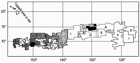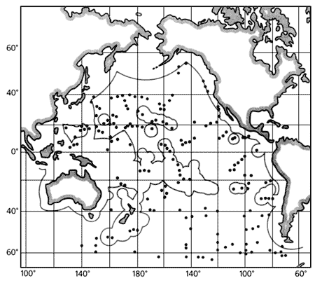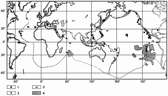 4 - области сплошного распространения металлоносных осадков.Правовые вопросы, возникшие в связи с предполагаемыми добычными работами в международных водах, были разрешены путем создания при ООН Подготовительной комиссии Международного органа по морскому дну, которая была уполномочена выдавать лицензии на заявочные участки. Наиболее перспективная для добычи конкреций зона Кларион-Клиппертон была поделена между несколькими заявителями - государственными организациями и международными горнорудными консорциумами. Многие залежи рудных корок, особенно в центральной части Тихого океана, оказались в пределах 200-мильных экономических зон островных государств, которые обладают монопольными правами на их освоение.