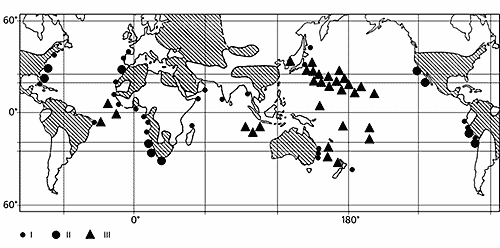 Распространение фосфоритов на дне океанов. Обозначены: мелкие (I) и крупные (II) залежи фосфоритов в приконтинентальных районах и фосфориты на подводных горах открытого океана (III). Заштрихованы части континентов, обеспеченные фосфатным сырьем за счет наземных месторождений.Генезис фосфоритов на подводных горах и возвышенностях объясняется аналогичным образом для мелководных этапов геологической истории поднятий, когда они омывались поверхностными водами. Вопрос о том, происходила ли фосфатизация пород при глубоководной стадии развития подводных гор, остается спорным и требует дополнительного исследования.О перспективах освоения рудных ресурсов