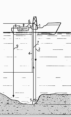 Принципиальная схема разработки конкреционных океанских месторождений методом гидроподъема на специально оборудованном судне. 1, 2 - водяной насос и трубопровод для подачи воды к рабочей головке; 3, 4 - компрессор и трубопровод для подачи сжатого воздуха в пульпу; 5 - рабочая головка с гидромонитором для размыва грунта и всасывающим устройством; 6, 7 - насос и трубопровод для подъема пульпы с конкрециями; 8, 9 - насос и трубопровод для откачки отработанной пульпы и укладки на дно. Система разработана в Московской горной академии.Ресурсы фосфоритов, потребность в которых по мере расширения сельскохозяйственного производства неуклонно растет, оцениваются примерно в 20-25 млрд т Р2О5 на подводных окраинах континентов и свыше 1 млрд т на подводных горах. При этом многие страны и регионы, имеющие выход в океан, не обеспечены наземными ресурсами фосфоритов, что стимулирует исследование возможностей их освоения.