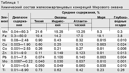 Химический состав океанских конкреций крайне разнообразен: в тех или иных количествах присутствуют практически все элементы периодической системы. Для сравнения в таблице 1 приводятся средние содержания главных рудных элементов в морских железомарганцевых конкрециях и в глубоководных пелагических осадках.
