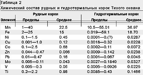 В химическом составе рудных корок Тихого океана, изученных наиболее детально, доминируют марганец и железо, при средних содержаниях соответственно 22.5 и 15% (табл.2). Наиболее ценный компонент - кобальт - концентрируется местами до 2.5%, при среднем содержании 0.68%. В некоторых районах, например на подводных склонах Гавайского хребта и о-вов Туамоту, в корках отмечалось повышенное содержание платины (до 4 г/т), серебра (до 3.7 г/т) и золота (до 0.169 г/т).