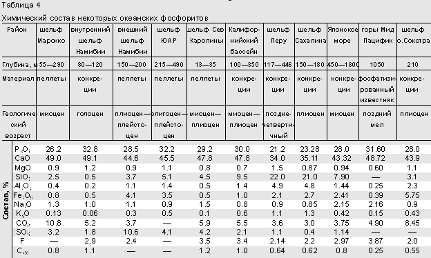 Химический состав фосфоритов варьирует в зависимости от соотношения фосфатных и нефосфатных компонентов. Так, содержание Р2О5 колеблется в них от 10 до 39.5% (табл.4). Анализ относительно чистого фосфатного вещества, выделенного из наиболее молодых (голоценовых) океанских образцов, показал, что оно характеризуется повышенными по сравнению с фосфоритами на континентах содержаниями легкорастворимого фосфора, адсорбционной воды, хлора и натрия, частично входящего, видимо, в кристаллическую решетку апатита. Содержание в современных фосфоритах урана оказалось сопоставимым с таковым в древних фосфоритах, а редкоземельных элементов - многократно ниже, что свидетельствует о накоплении первого в раннем диагенезе, а вторых - в постседиментационных процессах.