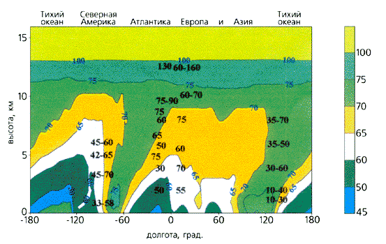 Июльское распределение отношения смеси озона (млрд-1 по объему) в поясе 30-60°с.ш., рассчитанное с помощью двумерной фотохимической модели атмосферы Главной геофизической обсерватории им.А.И.Воейкова [7]. Черными числами на рисунке показаны результаты измерений на соответствующих высотах и долготах.Важная часть современных исследований - ассимиляция (усвоение) этих баз данных в моделях различной сложности. При этом параметры подбираются из условия наибольшей близости измеренных и модельных значений содержания примесей в точках (регионах). Таким образом производится проверка качества моделей, а также экстраполяция измеренных величин за пределы регионов и периодов проведения измерений.