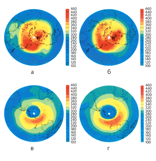 Общее содержание озона (в единицах Добсона; 1 ед. Добсона = 10-3 см слоя озона при 15°С на уровне моря) над Северным полушарием в марте 2000 г. (а и б) и над Южным полушарием в октябре 1998 г. (в и г). Данные получены в результате модельных расчетов (а и в) и спутниковых измерений (б и г). Для расчетов использована трехмерная модель [8].Прогнозирование изменений состава атмосферы и климата Земли. Рассматривая тенденции - тренды содержания атмосферных газов, оценки их источников, темпы роста населения Земли, скорости увеличения производства всех видов энергии и т.д., - специальными группами экспертов создаются и постоянно корректируются сценарии вероятного загрязнения атмосферы в ближайшие 10, 30, 100 лет. Исходя из них, с помощью моделей прогнозируются возможные изменения газового состава, температуры и циркуляции атмосферы. Таким образом удается заблаговременно обнаружить неблагоприятные тенденции в состоянии атмосферы и можно попытаться их устранить. Антарктический шок 1985 г. не должен повториться.