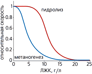Относительная скорость гидролиза и метаногенеза в зависимости от концентрации летучих жирных кислот. Ингибирующая концентрация ЛЖК для гидролиза значительно выше, чем для метаногенеза.Естественно предположить, что в гетерогенной толще свалки "выживает" лишь часть очагов метаногенеза. Чрезмерная диффузия жирных кислот в его начальные очаги, где концентрация микробов еще невысока, подавляет их развитие. В то же время в ходе усвоения жирных кислот метаногенная популяция увеличивается, и уже через некоторое время та же диффузия будет способствовать образованию метана. Недавно Р.Струт и др. экспериментально показали, что задержка эффективного перемешивания ускоряет разложение твердых бытовых отходов [11].Среди технических приемов, влияющих на общую скорость деградации органического вещества и его превращения в метан, наиболее значимы рециркуляция фильтрата и изначальное введение активных метаногенов. Как показала одномерная распределенная модель биореактора, разложение твердых бытовых отходов и выделение метана ускоряются, если во всем реакторе поддерживается нейтральная среда [12]. По рекомендациям Д.Рейнхарт и Т.Таунсенд, рециркуляция фильтрата в действующих свалках должна вводиться медленно [13]. Согласно распределенной модели, такая эксплуатация свалки способствует сохранению активных очагов метаногенеза. Предварительное пространственное разделение твердых бытовых отходов и метаногенной биомассы позволяет исключить ингибирующее влияние летучих жирных кислот и стимулировать превращение органики в метан. К такому же эффекту должно приводить и отсутствие принудительного усреднения реакционного пространства в начальный период разложения отходов. Подача кислорода в толщу свалки (сравнительно новый технический прием) способствует быстрому окислению жирных кислот и повышению температуры среды. При этом уменьшается ингибирующая концентрация жирных кислот, что в дальнейшем ускоряет деградацию всех твердых органических веществ [14].