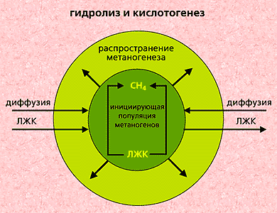 Механизмы анаэробного распада органических веществ изучались на экосистемах анаэробных реакторов, донных отложений и почв. Условия свалки хорошо имитируются в лабораторных цилиндрических лизиметрах [4]. Распад биополимеров (углеводов, белков и жиров) начинается с гидролиза, который осуществляют микроорганизмы, имеющие специальные ферменты - гидролазы. Их размножению и распространению по поверхности твердого субстрата способствует вода. Продукты этой реакции потребляются гидролитиками и другими кислотогенными микроорганизмами, в результате чего образуются летучие жирные кислоты (уксусная, пропионовая, масляная), а также водород. Фаза, условно объединяющая гидролиз и кислотогенез, называется кислотогенной. При накоплении жирных кислот понижается pH среды, а при pH < 6.0 конечная метаногенная фаза подавляется.