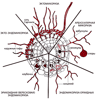 В центре — поперечный срез корня.При таком симбиозе растения получили дополнительное питание в виде элементов, находящихся в труднодоступной форме (фосфаты). Возникла способность к межклеточной регуляции развития микроорганизмов в кортексе корня, к образованию внутриклеточных симбиотических структур, а также к усвоению хитиноподобных метаболитов микросимбионта.