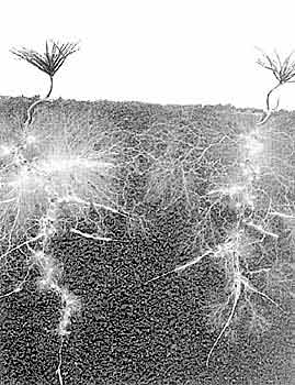 Что же получили растения от такого содружества? Прежде всего улучшилось корневое питание, поскольку увеличился объем почвы, охватываемой всасывающей поверхностью. Радиус грибной гифы на два порядка меньше радиуса корневого волоска, поэтому поверхность корня на единицу объема (или веса) в 100 раз меньше поверхности гифы, т.е. для продукции одинаковой всасывающей зоны растению требуется в 100 раз больше материала, чем грибу.