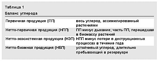 Нетто-экосистемная продукция — один из наименее изученных компонентов углеродного баланса (табл.1). Уравновешиваются ли потери углерода в ходе деструкции его накоплением в результате фотосинтеза и каковы временные соотношения между этими процессами? Окончательного ответа пока нет.