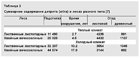 Углеродная емкость лесного детрита зависит от двух показателей: годичного поступления опада (листьев) и отпада (веток) — DD и скорости деструкции (табл.2). Листья разлагаются в полтора-два раза быстрее, чем древесина, что не удивительно, и кроме того, в холодном климате разрушение опада в четыре раза продолжительнее, чем в теплом [7]. В нашей стране, где наибольшие площади под лесами приходятся на холодную зону, ежегодно разлагается примерно 10% опада.