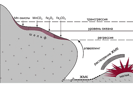 Выше мы приводили данные, свидетельствующие об окисленности вод древнего раннепротерозойского океана. Но не только это препятствует принятию предлагаемых моделей. В частности, считается, что крупные Mn-рудные отложения образуются только при высоком уровне моря, на пике трансгрессии при сильном апвеллинге, выносящем огромные объемы глубинных вод на шельф. Однако сочетание медленного окисления основных масс морской воды и относительно быстрого отложения руд с геохимической точки зрения противоречиво. Нет ясности и в том, что послужило причиной трансгрессии. Данная модель не отвечает также на главный вопрос: почему рудные месторождения не образовались на других окраинах древнего континента, а сконцентрировались в относительно локальных границах? Необходимое условие геологически быстрого образования крупнейших месторождений Mn - предварительная концентрация его в других формах. Скорее всего это были окисные Fe-Mn-отложения, формировавшиеся в окисленных водах раннепротерозойского океана в течение сотен миллионов лет. Каким же образом металлы могли оказаться вынесенными из глубин океана и отложенными на окраине континента в шельфовой зоне? Здесь следует согласиться с нашими предшественниками, считающими, что растворение Mn и Fe произошло в восстановленных (лишенных кислорода) океанских водах.