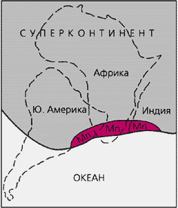 Реконструкция области распространения Mn- и Fe-рудных формаций на окраине протерозойского суперконтинента. Построена с учетом современного расположения кратонов - останцов древней коры. Контуры современных континентов нанесены условно.Но если в раннем протерозое существовал единый суперконтинент - древнейшая Пангея-0, - то и океан был единым. Предполагается, что переломным моментом в структурном развитии суперконтинента оказался рубеж 2200 - 2000 млн лет назад, когда началось его дробление и образование нескольких материковых блоков. Однако причина раскола этого континента и дрейфа отдельных блоков остается неясной.Надо отметить, что приводимые у разных авторов даты, относящиеся к столь отдаленным во времени геологическим событиям, нередко разнятся в пределах ±100 - 200 млн лет. По-видимому, эти неувязки, составляющие 5 - 10% от абсолютных величин, не очень принципиальны.