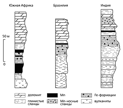 Стратиграфические формации, включающие Mn-отложения, ассоциирующие с Fe-формациями в южной части Африки, Бразилии и Индии [15, с упрощ.].Современная наука редко учитывает влияние космических факторов для расшифровки событий геологического прошлого Земли. Между тем только в фанерозое (570 млн лет) на Землю упало около 200 крупных астероидов диаметром более 3.5 км. Причем характер космического воздействия на протяжении всей истории Земли практически не менялся [18]. В ранней истории Земли подобные эпизоды исключать тем более нельзя, хотя океанские пучины не оставляют нам никаких следов, если не считать косвенных свидетельств - гигантских осадочных Fe- и Mn-рудных формаций на окраинах континентов.Сейчас крупные фрагменты раннепротерозойского суперконтинента с типичными рудными формациями, которые образовались одновременно и в одинаковых условиях, находятся на разных материках - в Южной Америке, Африке, Азии. Они имеют важное значение не только для построения достоверных палеогеодинамических реконструкций, но и для разработки новых подходов к решению проблемы марганценакопления на Земле, до сих пор рассматривавшейся раздельно для месторождений суши и отложений океана. Теперь появилась возможность найти взаимосвязь между Mn-рудными процессами на суше и в океане и рассматривать их в единстве. Впрочем, замыкающая часть этого единства - возвращение Mn из океана на сушу - может осуществиться лишь в двух случаях: либо при промышленном освоении океанских богатств, либо при очередной глобальной катастрофе.