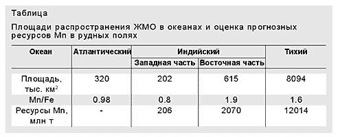 В общей сложности накопления Mn в Тихом океане и восточной части Индийского в 70 раз превосходят накопления в западной части Индийского океана и в Атлантике. Иными словами, по содержанию марганца в железомарганцевых отложениях Мировой океан можно разделить на два резко асимметричных сектора - Индо-Тихоокеанский и Индо-Атлантический. Надо отметить, что в Атлантике прогнозные ресурсы Mn вообще весьма бедны и мало перспективны для освоения. Выявление причин отмеченной асимметрии открывает новые пути для решения проблемы океанского рудогенеза.