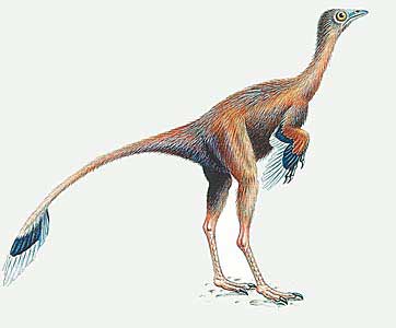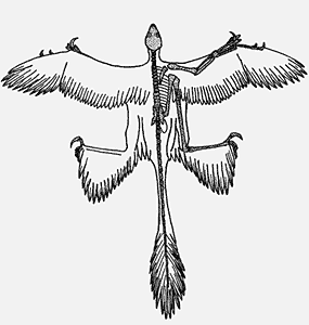 Реконструкция внешнего вида протархеоптерикса – оперенного целурозавра из нижнемеловых отложений Китая. (D.Palmer, ed. 1999. Encyclopedia of Dinosaurs.) Теперь, как мы знаем, у археоптерикса не осталось ни одного прогрессивного признака настоящих веерохвостых птиц (к ним относятся все современные птицы и некоторые вымершие отряды). Характерные для него оперение, крючковидные отростки на ребрах и вилочка, бумерангоподобная кость плечевого пояса — все эти черты сегодня выявлены у представителей различных тероподных динозавров. В то же время у них и у археоптерикса нет типичных птичьих признаков (гетероцельных позвонков, больших лобных костей, двухголовчатой квадратной кости, подвижного сочленения между коракоидом и лопаткой, при их удлиненной форме, истинного интертарзального сочленения в пяточном суставе и др.). О чем это свидетельствует? Расхождение по таким важным системным признакам должно указывать на отсутствие прямых родственных связей между веерохвостыми птицами и тероподными динозаврами вместе с археоптериксом, т.е. на их независимое происхождение.