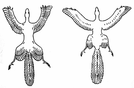 Микрораптор — первый маленький дромеозавр, явно способный передвигаться в воздухе, по меньшей мере, планируя, а возможно, и машущим полетом [4]. В связи с его открытием вспомнили о давней гипотезе У.Биба о гипотетическом тетраптериксе (Tetrapteryx) с оперенными передними и задними конечностями [11] и гипотетической проптице (Proavian) Ж.Хейльмана [12]. У тетраптерикса маховые перья “тазовых крыльев”, как их называл Биб, в первую очередь предполагались на бедрах. А у проптицы удлиненные чешуи изображались вдоль заднего края бедер и плечевых сегментов, вдоль боков тела и хвоста. Биба к такой гипотезе привела находка крупных перьевых пеньков, появляющихся на задней стороне бедер у 3—4-дневных птенцов горлицы, домашнего голубя и яканы. К тому же на фотографиях берлинского экземпляра археоптерикса он увидел удлиненные перья на бедрах, чего другие исследователи не смогли подтвердить. Хейльман искал зачатки крупных перьев на ногах у птенцов многих птиц, но обнаружил их только на бедрах у домашнего голубя. Поэтому он хотя и согласился в общем виде с гипотезой Биба, но полагал, что дополнительные несущие поверхности для планирования возникали у гипотетической проптицы только на этапе удлиненных чешуй.